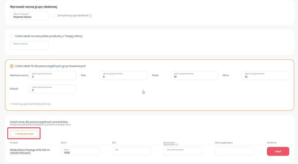 3. Trzecią opcją jest przypisanie dedykowanych cen do grupy towarowej naciśnij dodaj produkt i wybierz z listy produkt jaki Cię interesuje .
