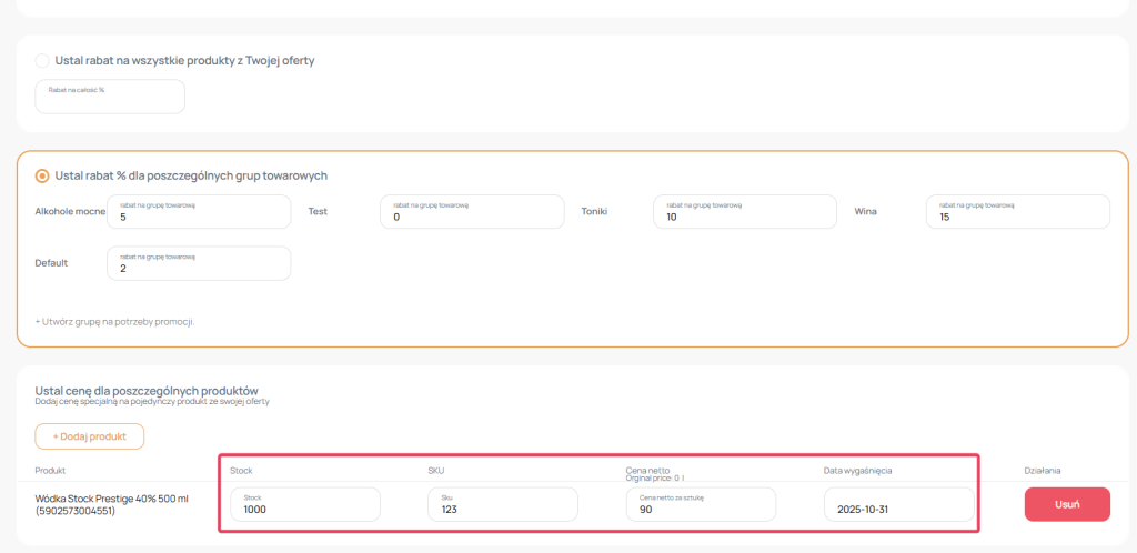 2. Zaznaczająć drugi radiobuton możesz przydzielić rabat procentowy na określone prędzej grupy towarowe do których przydzieliłeś produkty.