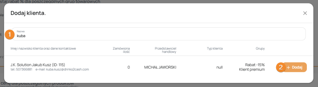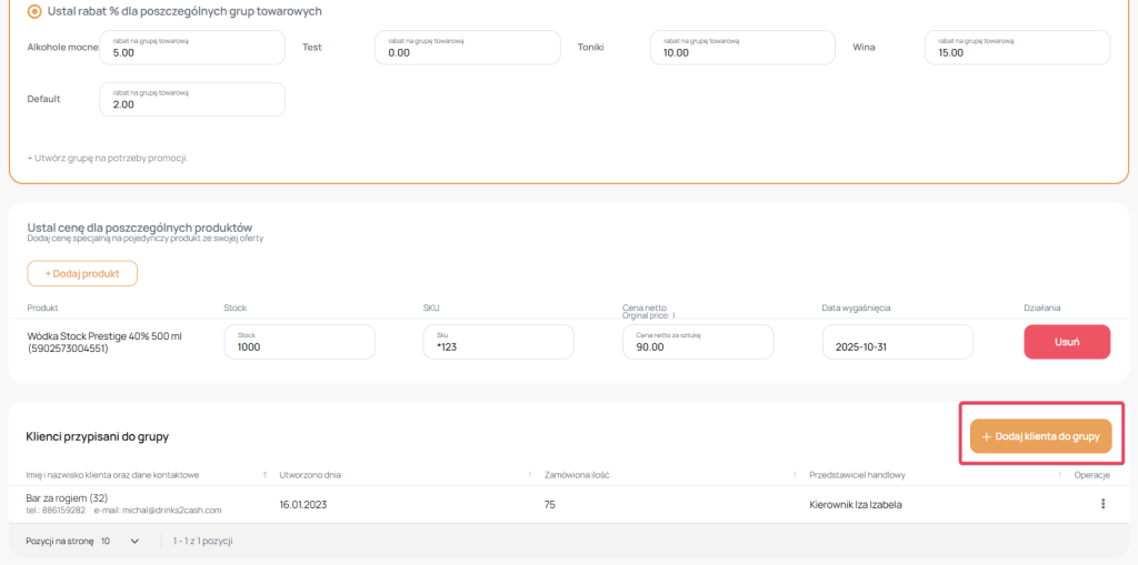 Po wprowadzeniu zmian zapisz zmiany . Następnie wróć do tej samej grupy , na samym dole pojawi się tabelka w której możesz dodać klientów , naciśnij „Dodaj klienta do grupy”