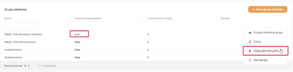 Zaznacz domyślna grupa rabatowa tylko wtedy gdy grupa (i zawarte w niej rabaty) mają obowiązywać każdego nowego klienta (tj. po złożeniu pierwszego zamówienia w Twojej hurtowni, wszyscy klienci będą otrzymywać te warunki).