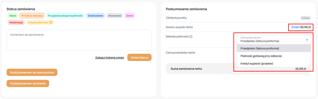 Z prawej strony widać podsumowanie zamówienia, czyli kwotę zamówienia, koszty dostawy oraz metodę płatności wybraną przez klienta. W tym miejscu również jest możliwość modyfikacji, np. kosztów dostawy lub metody płatności.