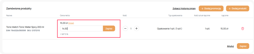 Można modyfikować zamówienie, np. zmienić ilość produktów lub zmienić cenę.