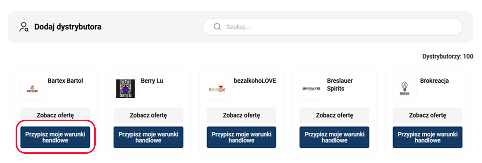 W zakładce dystrybutorzy znajdź swoich dostawców i kliknij przypisz moje warunki handlowe.