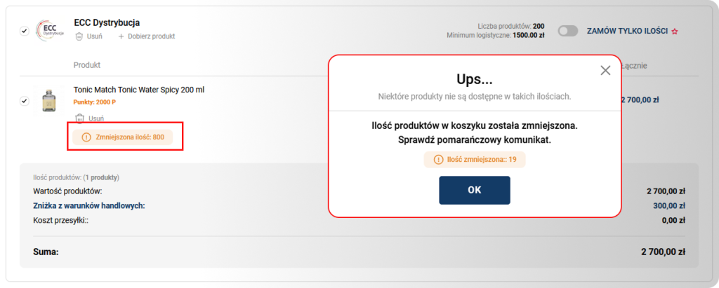 Jeśli danych dystrybutor nie posiada na stanie wybranej przez Ciebie liczby produktów, to pojawi się komunikat w koszyku.