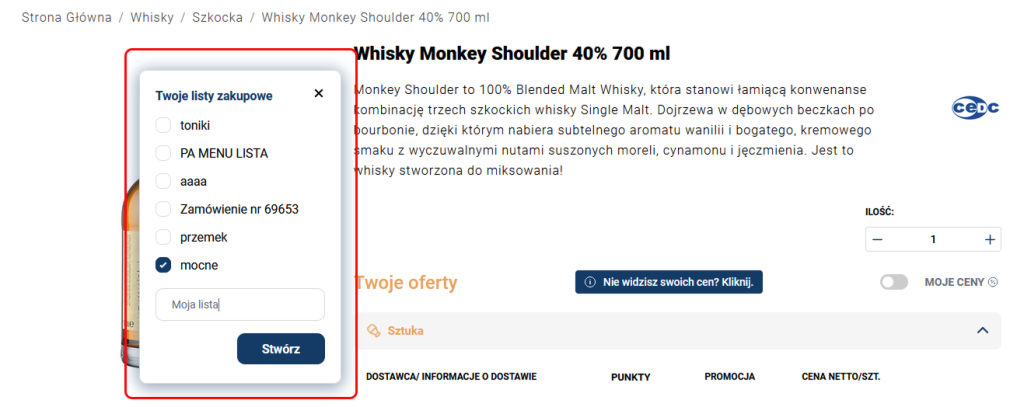 👀 W stworzonych listach zakupowych możesz porządkować oferty wybierając interesujących Cię dystrybutorów i dodawać produkty bezpośrednio do koszyka.