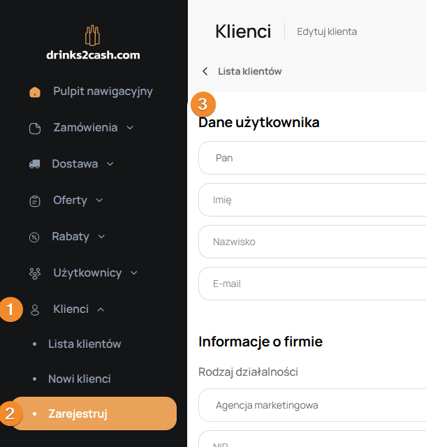 1. Z menu po lewej stronie wybierz klienci -> zarejestruj klienta.