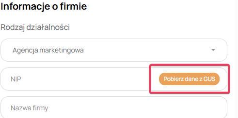 2. Wpisz potrzebne dane Twojego klienta aby przyśpieszyć pracę po wpisaniu numeru NIP naciścnij na „Pobierz z GUS” system uzupełni większość danych:.