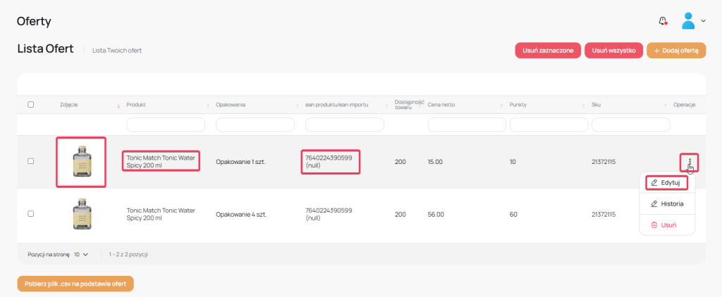 Na liście dostępnych ofert proszę kliknąć na zdjęcie, nazwę produktu, Kod EAN lub opcję ->Edytuj, aby przejść do edycji.