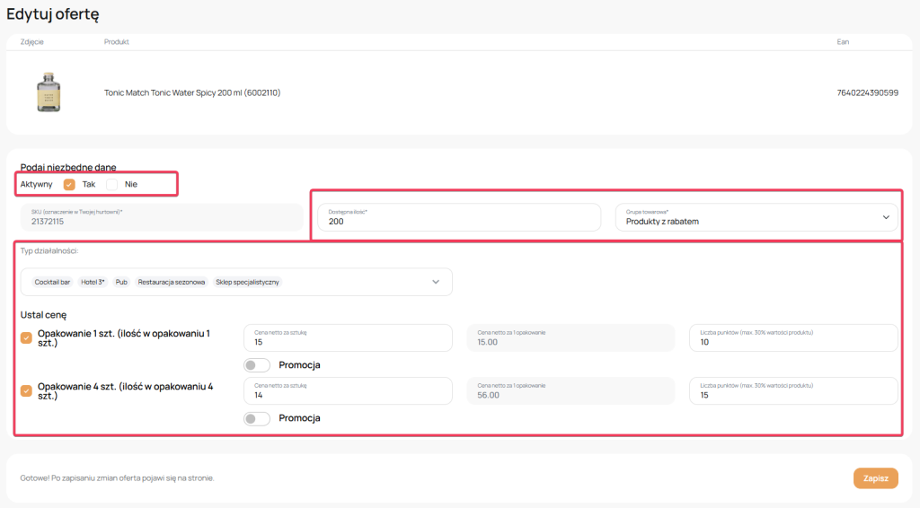Na karcie produktu możesz edytować zaznaczone poniżej parametry.