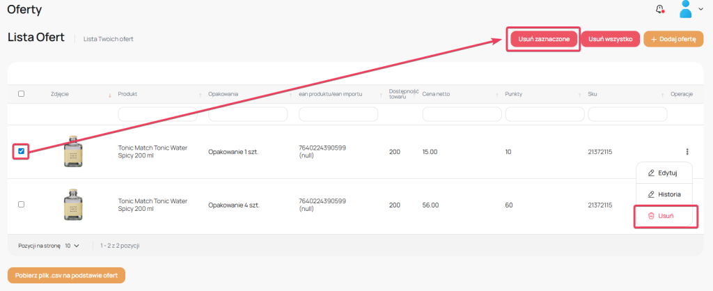 Aby usunąć ofertę przegodzimy do Oferty -> Lista zaznaczamy produkty które chcemy usunąć następnie klikamy klawisz „Usuń Zaznaczone” lub przy każdej ofertcie klikamy w operacje i usuń.