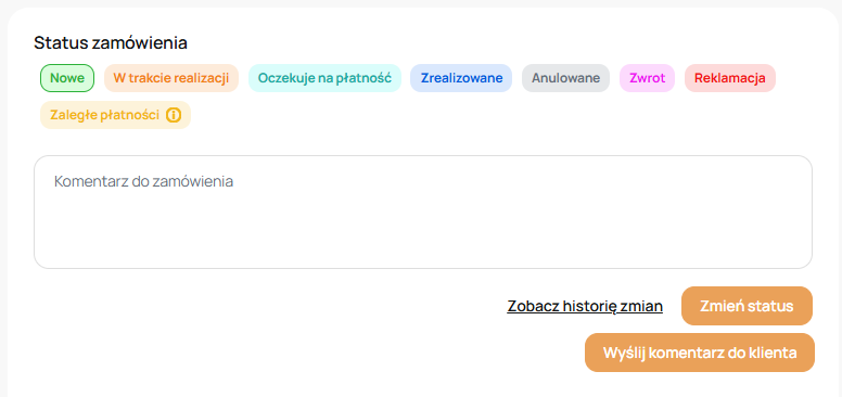 - Historia zmian: Można podejrzeć pełną historię zmian statusów, kto i kiedy zmieniał status zamówienia.