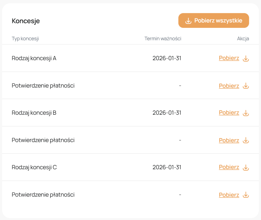 Kafelek „Koncesje” to miejsce, gdzie wyświetlane są wszystkie typy koncesji na handel alkoholem, które nasza platforma akceptuje. Mamy tu koncesje typu A, B i C. Przy każdej z nich widzisz datę ważności i potwierdzenie.